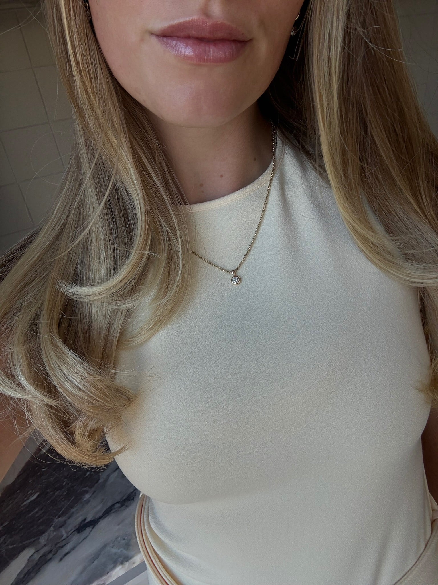Our Bubble Bezel Set Pendant features a round brilliant diamond centre stone, set in a 14k yellow gold bubble bezel.
