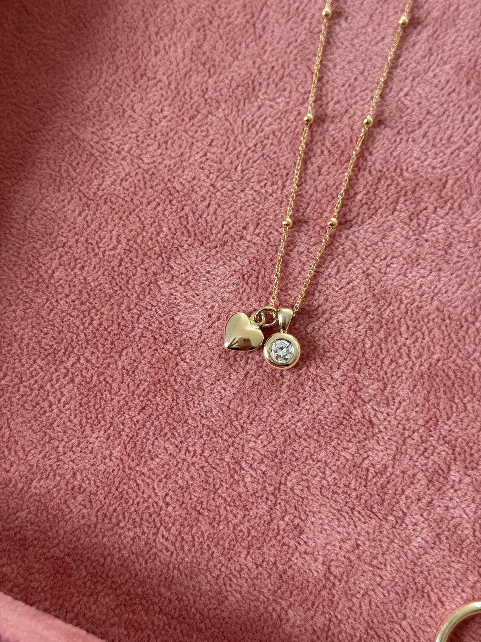 The pictured pendant is a 0.5 carat diamond on a solid gold chain, available for additional purchase via email. You can also pair this pendant with our gold-plated baller chains.