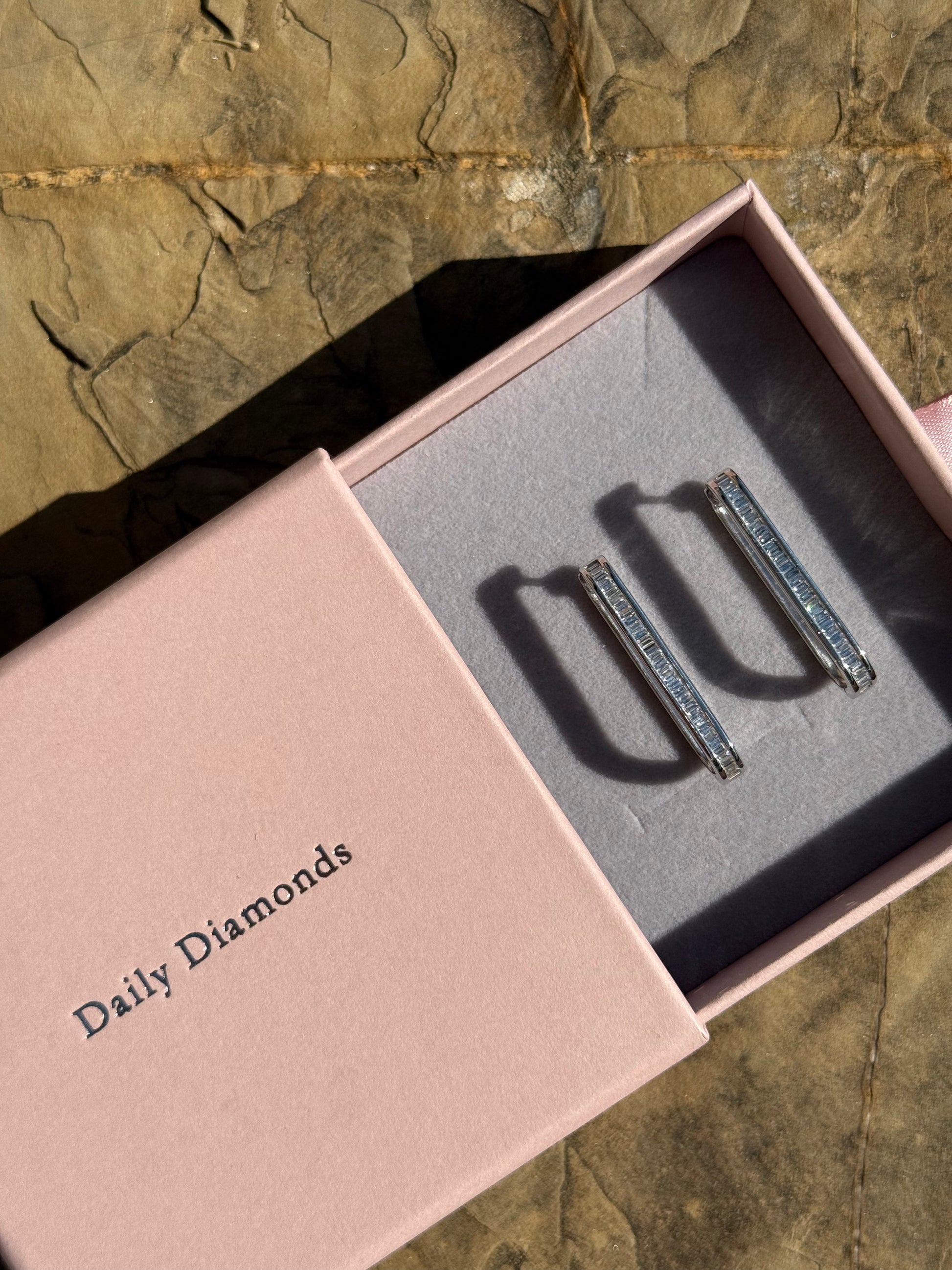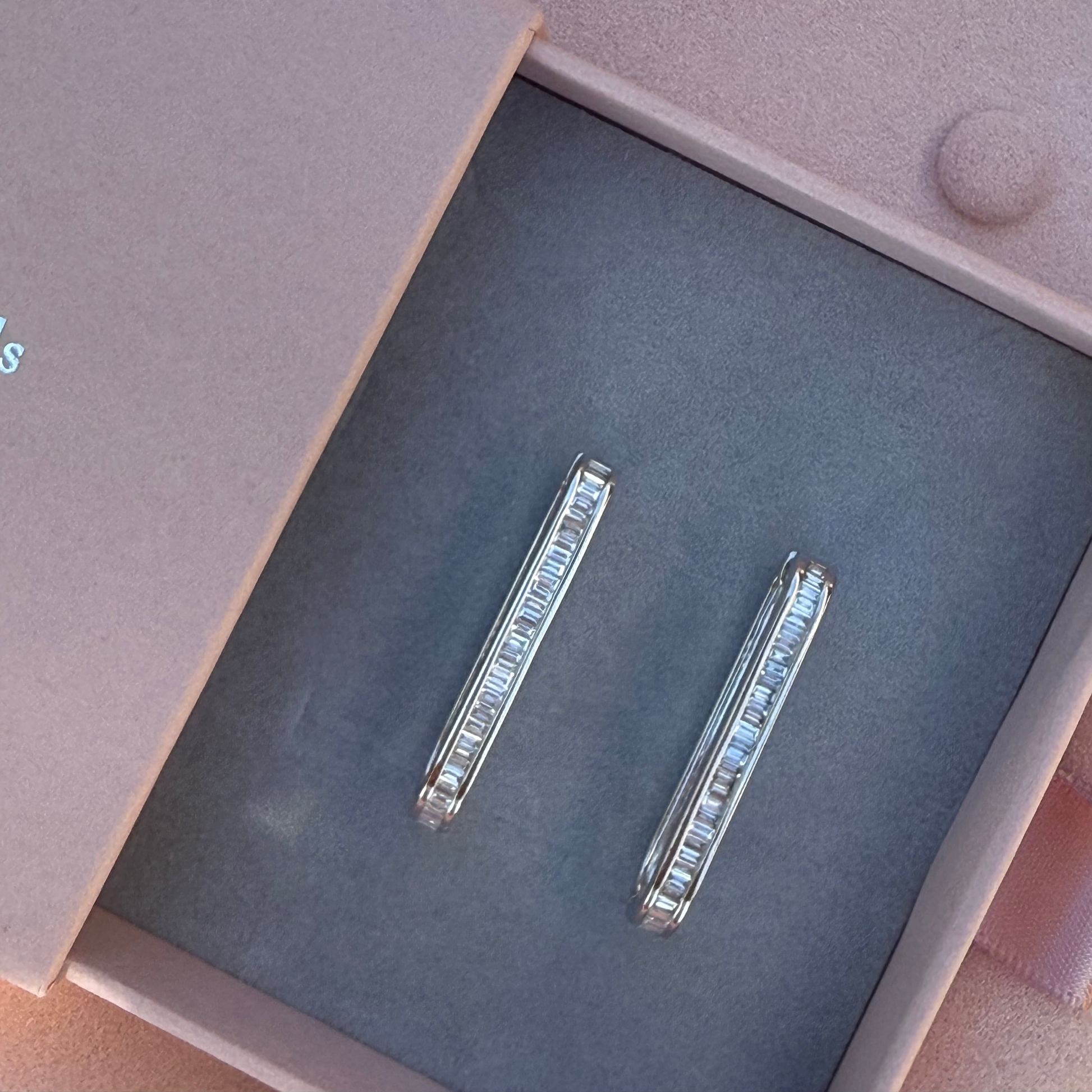 Designed with 74 baguette diamonds to keep you sparkling all night long! These Club 74 hoops are set in 14k white gold, and are 30mm in length.