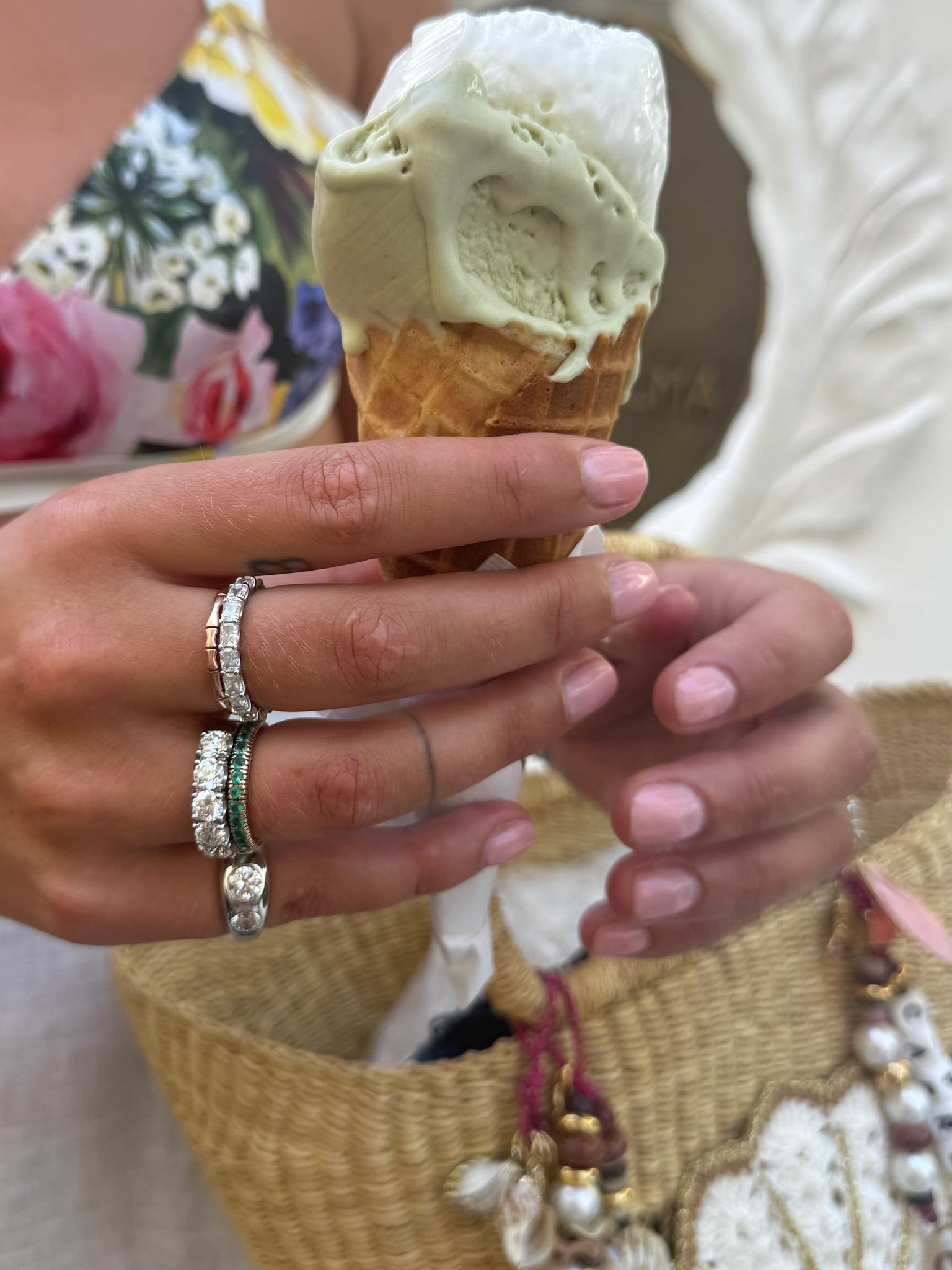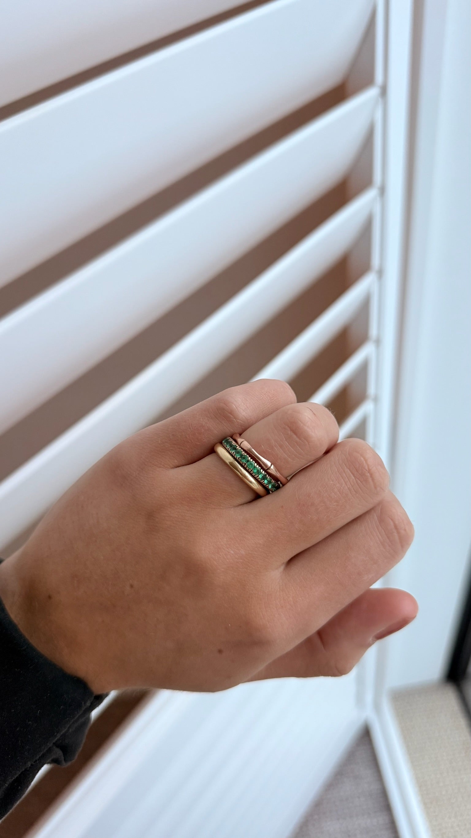 Our Emerald Stacker Band is a complement to any stack. Featuring a 14k yellow gold band with black rhodium detailing and 19 natural round emeralds.