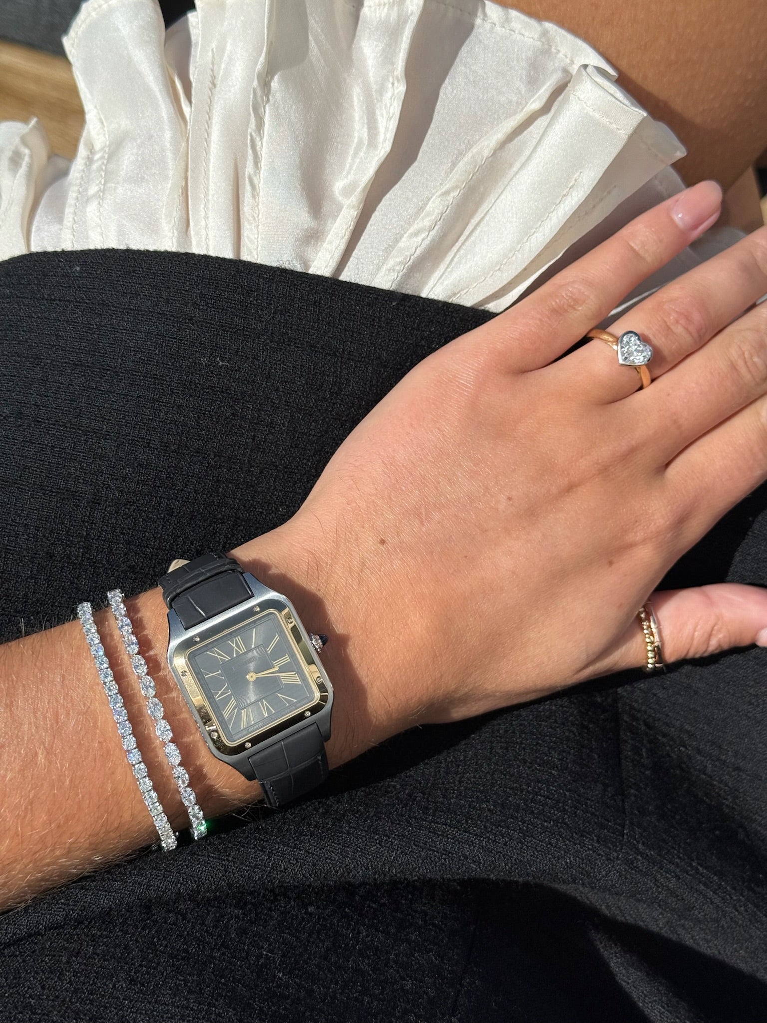 Our Heart Bezel Ring features a heart cut diamond, set in a 14k white gold bezel on a 14k yellow gold band. We love to wear this ring solo, or stacked with our puffy trio ring or mega diamond band.