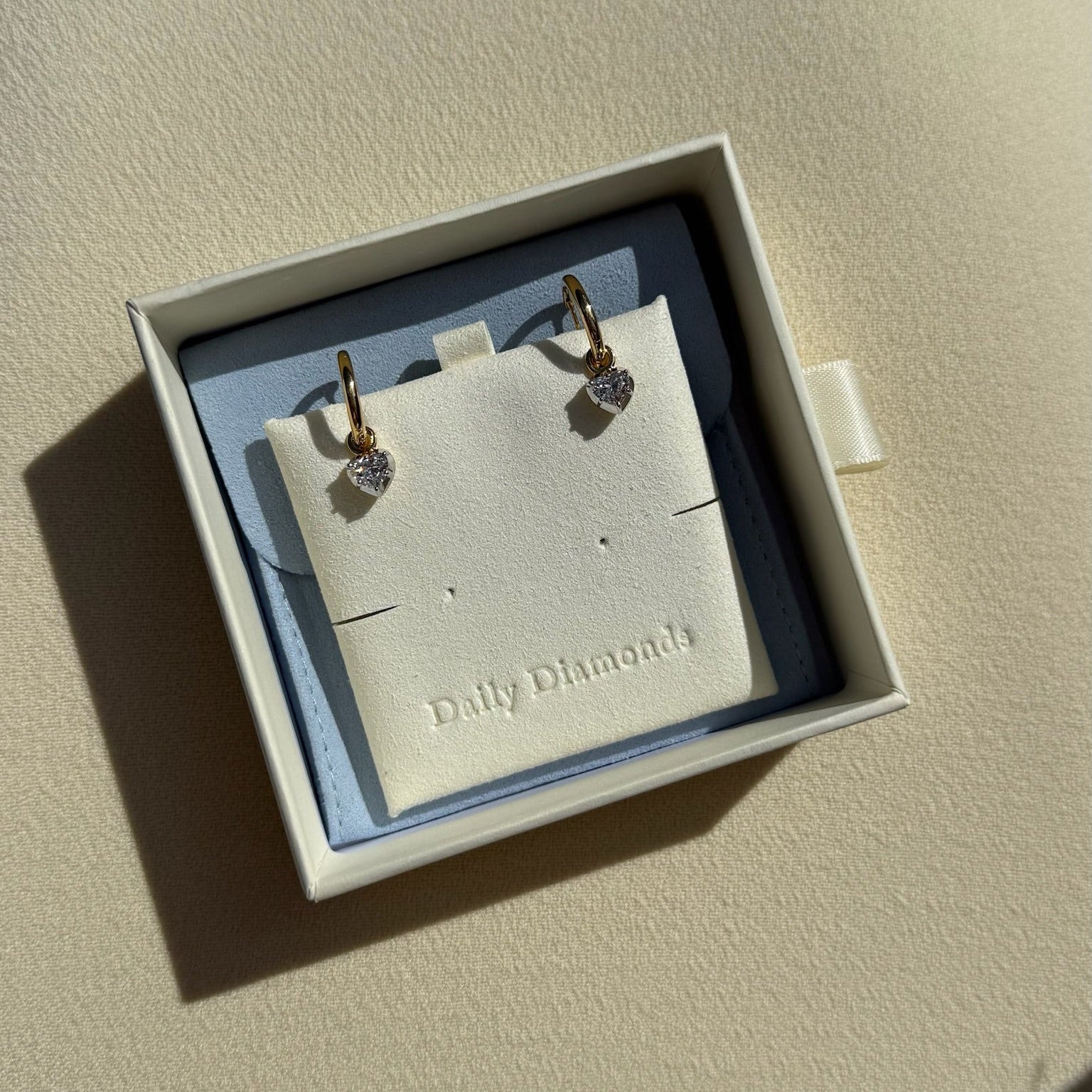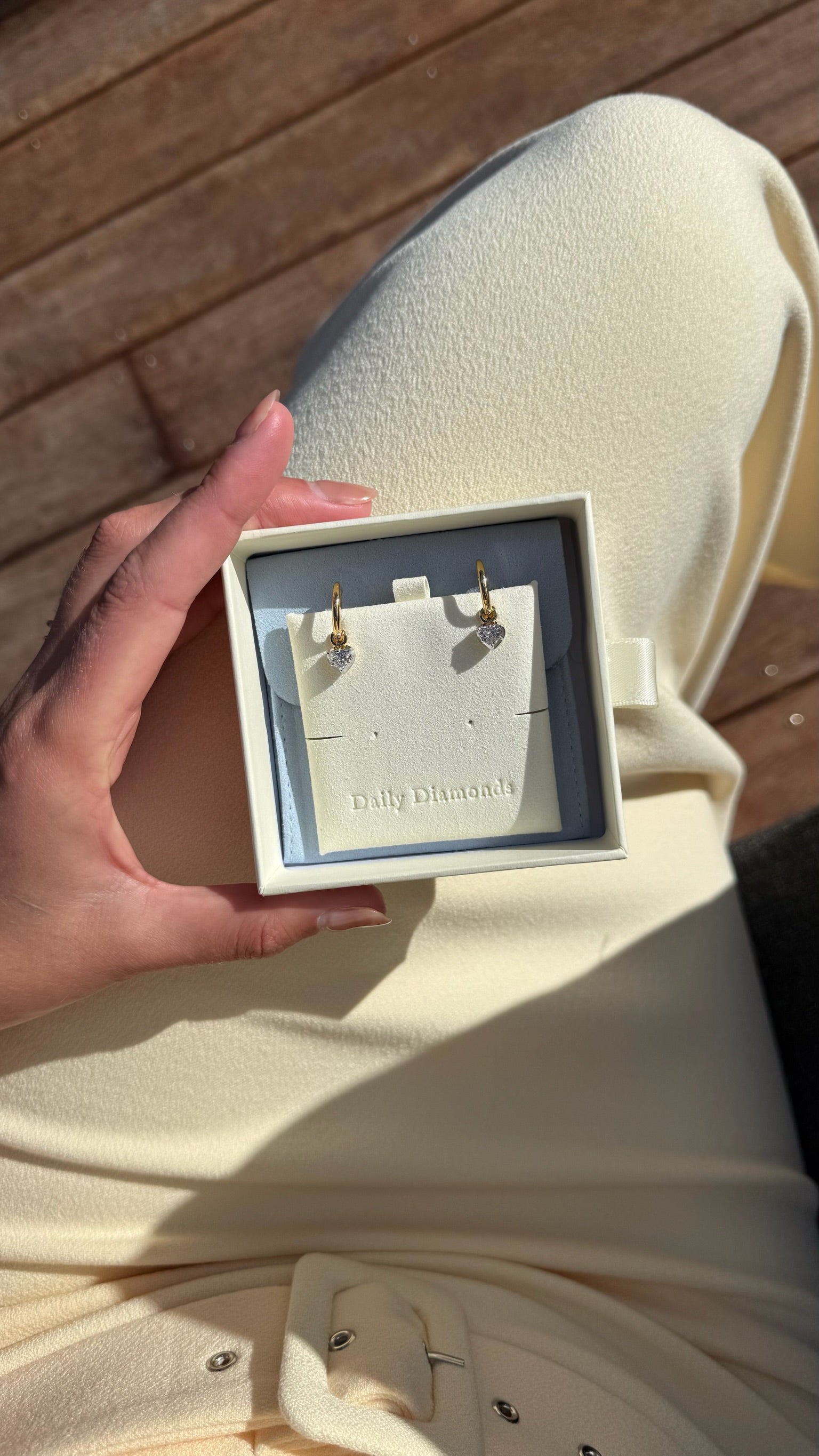 A solid 14k yellow gold hoop, accompanied by heart shaped diamonds set in a 14k white gold Georgian-inspired setting. A secure double-lock keeps them on from day to night.