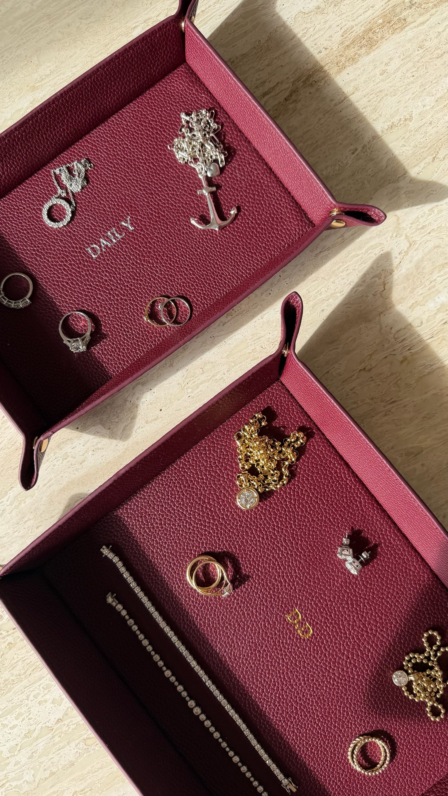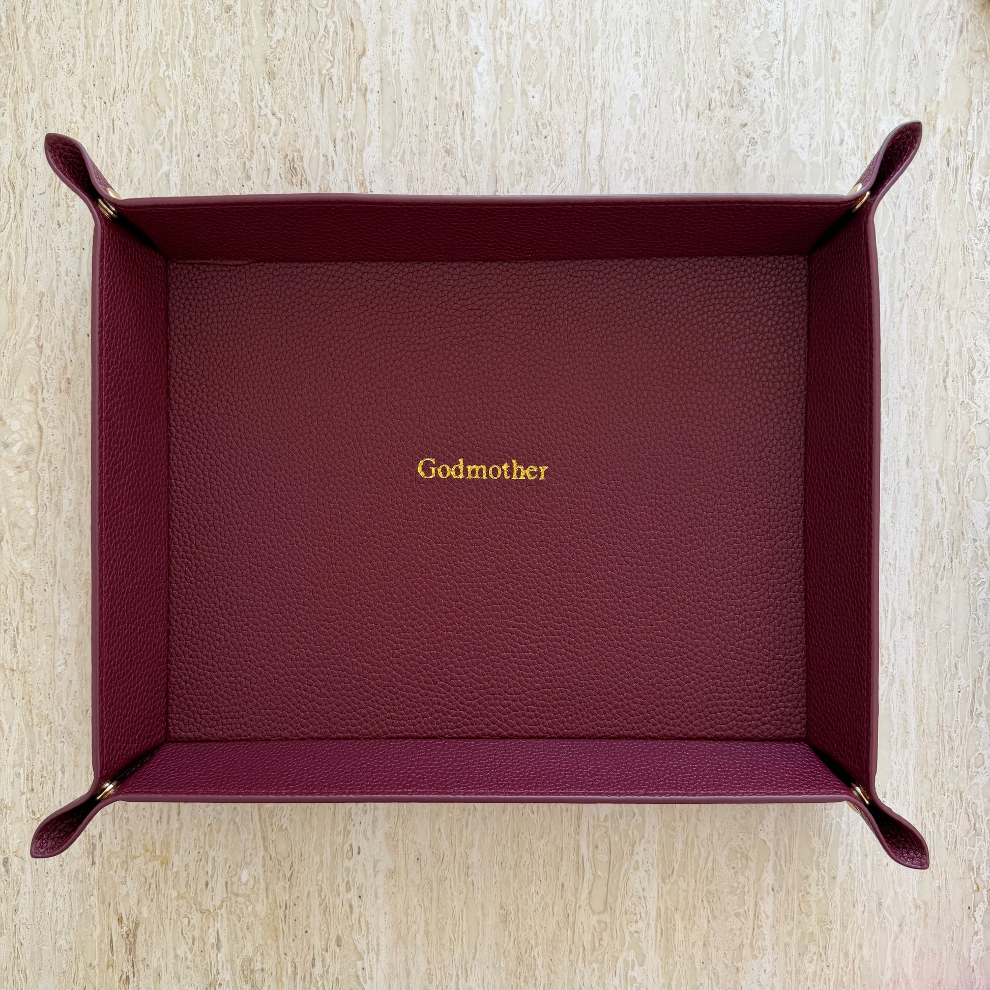Treat yourself (and your trinkets) to our popular pebbled leather trays! Each tray features gold snap closure sides and gold or silver text in the centre.