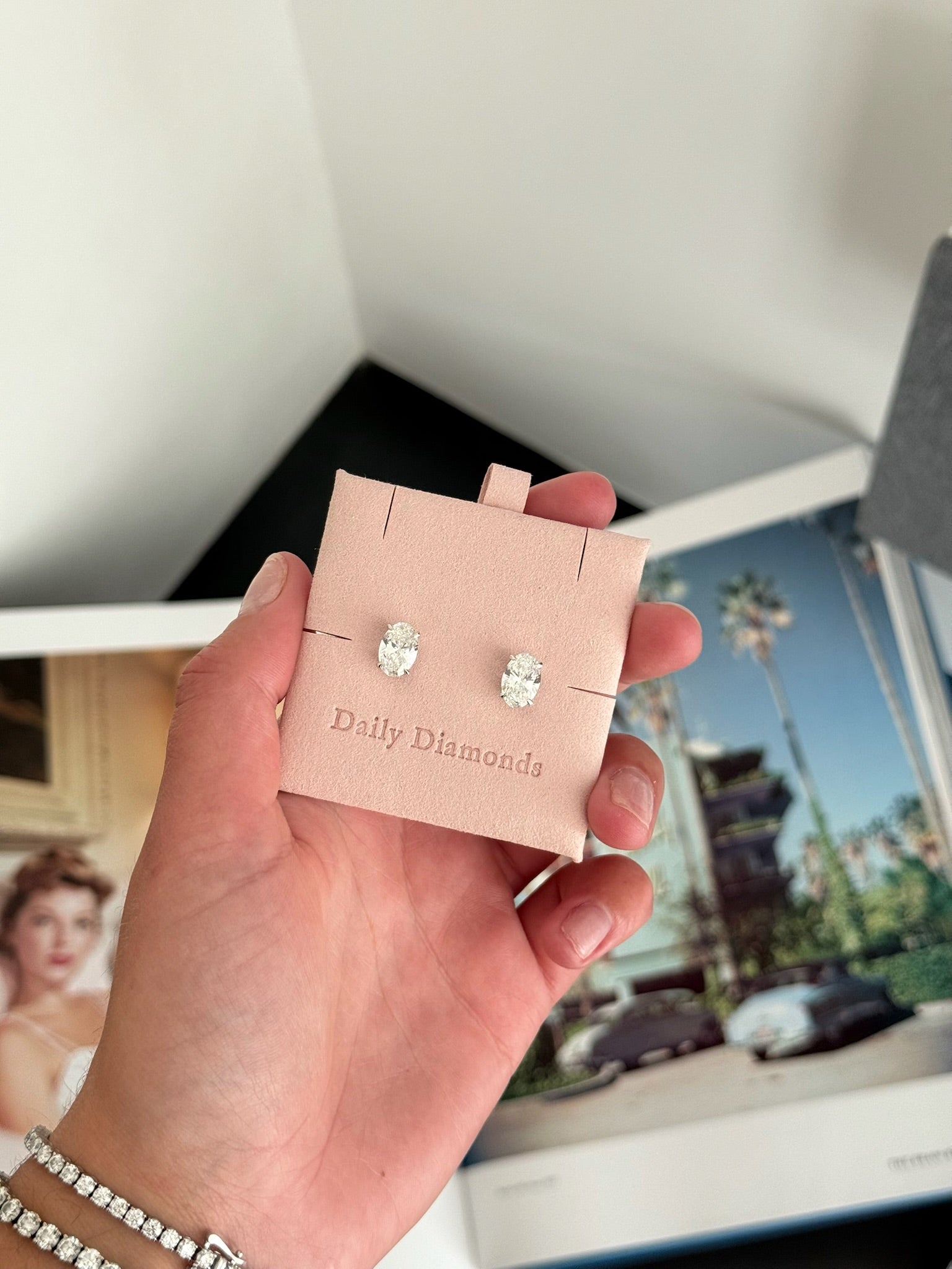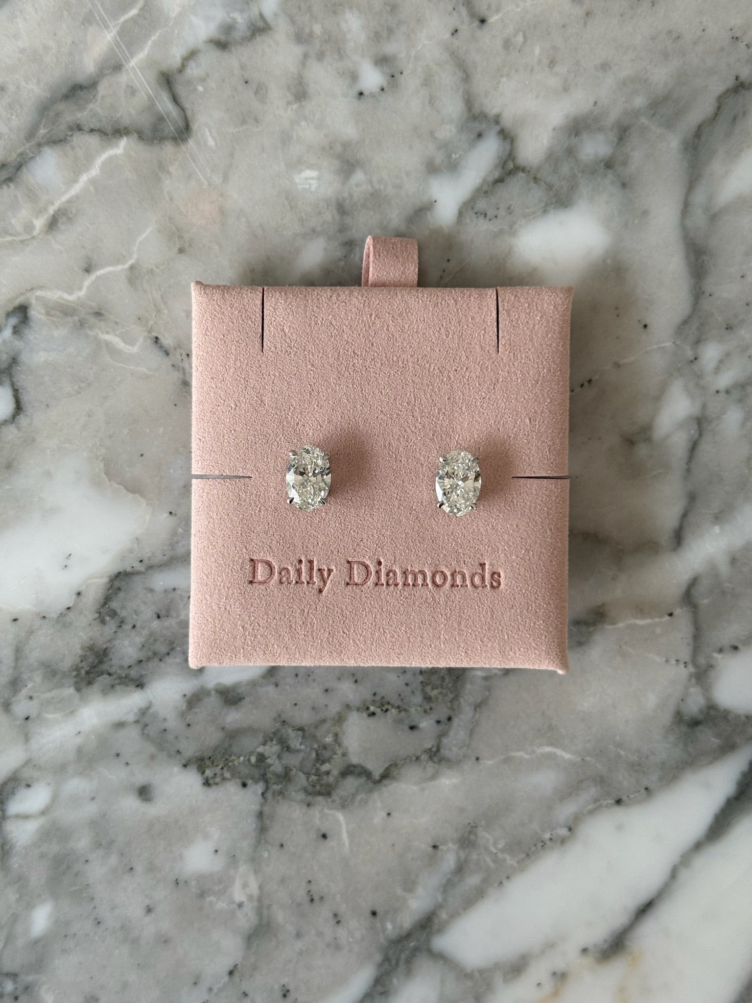 Gorgeous oval cut diamonds, set with 4 prongs in 14k white gold. A secure double-lock keeps them on from day to night. Changes to setting and gold choice is available upon request.