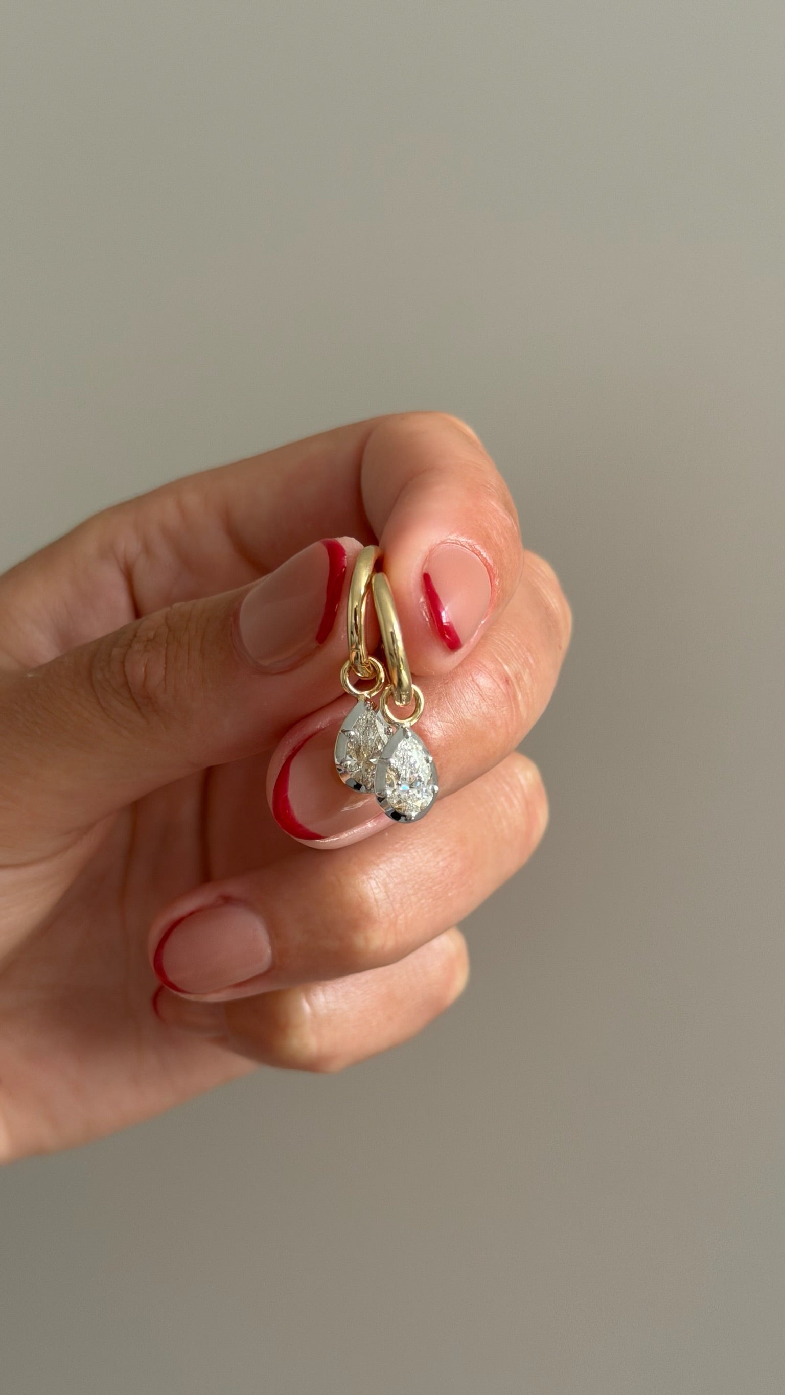 These classic pear diamond hoops are crafted with solid 14k yellow gold hoops and pear shaped diamonds, then finished with a georgian setting in the gold of your choice. The white or yellow finish makes diamonds really pop. A secure double-lock keeps them on from day to night.