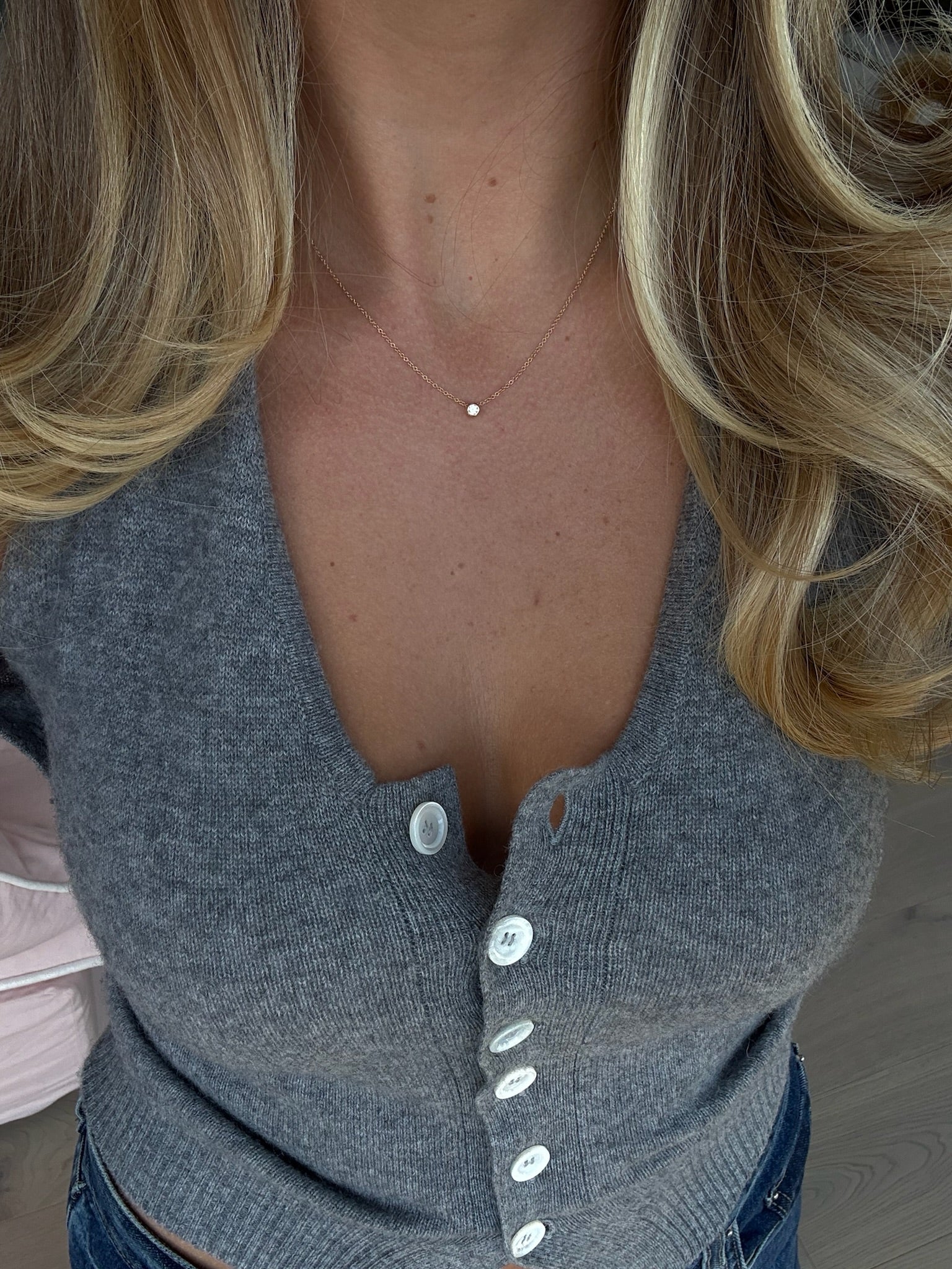 One sweet 0.10 natural diamond, set in a 9k gold bezel. The chain is versatile with 2 jump rings present meaning you can wear it at both 42cm and 45cm, making it the perfect grounding piece to your stack.