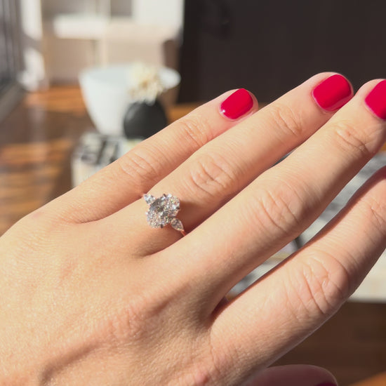 A 2 carat oval centre stone, flanked by two 0.5 carat pears. Set in 18k rose gold with tiger prongs.