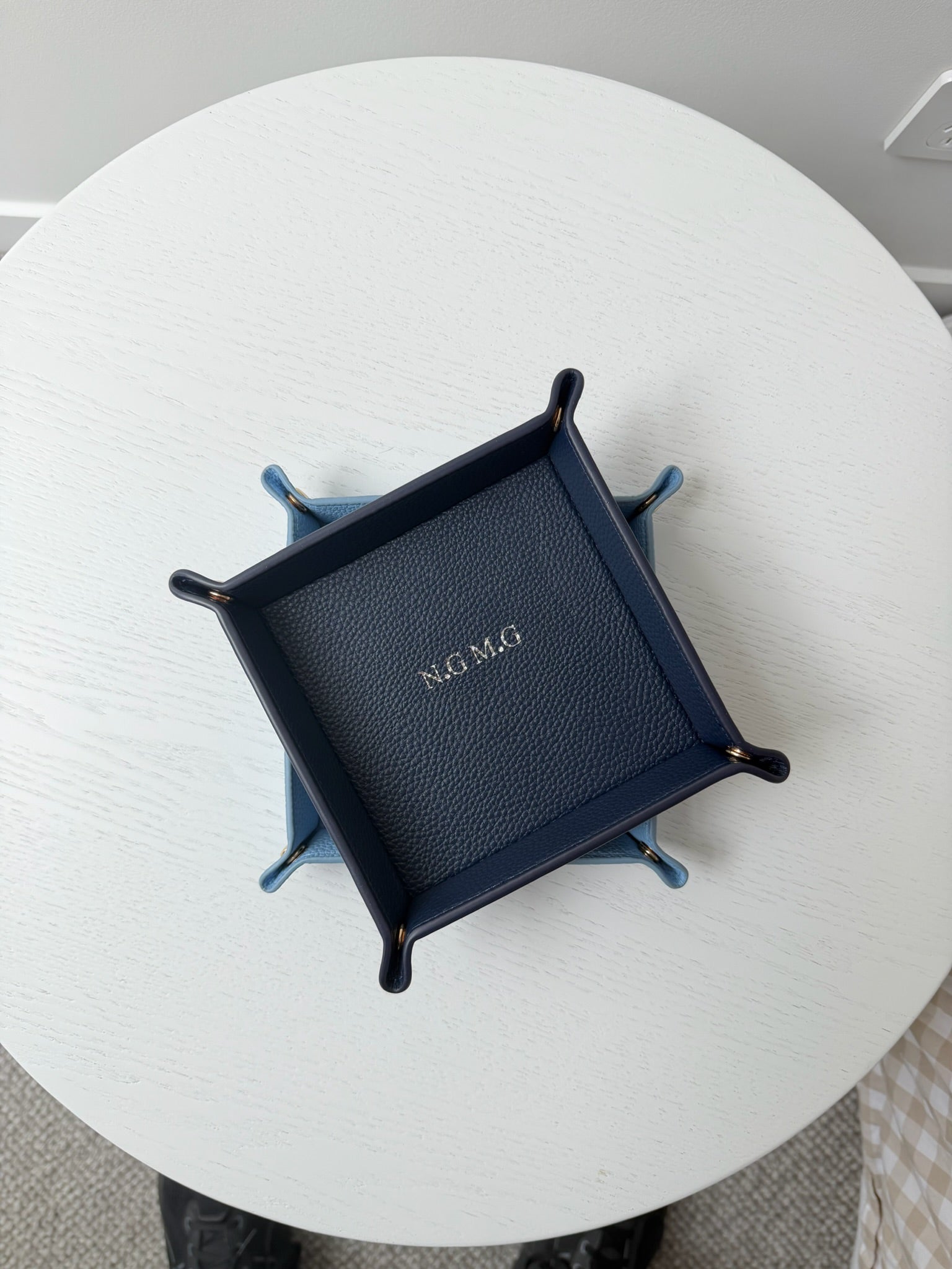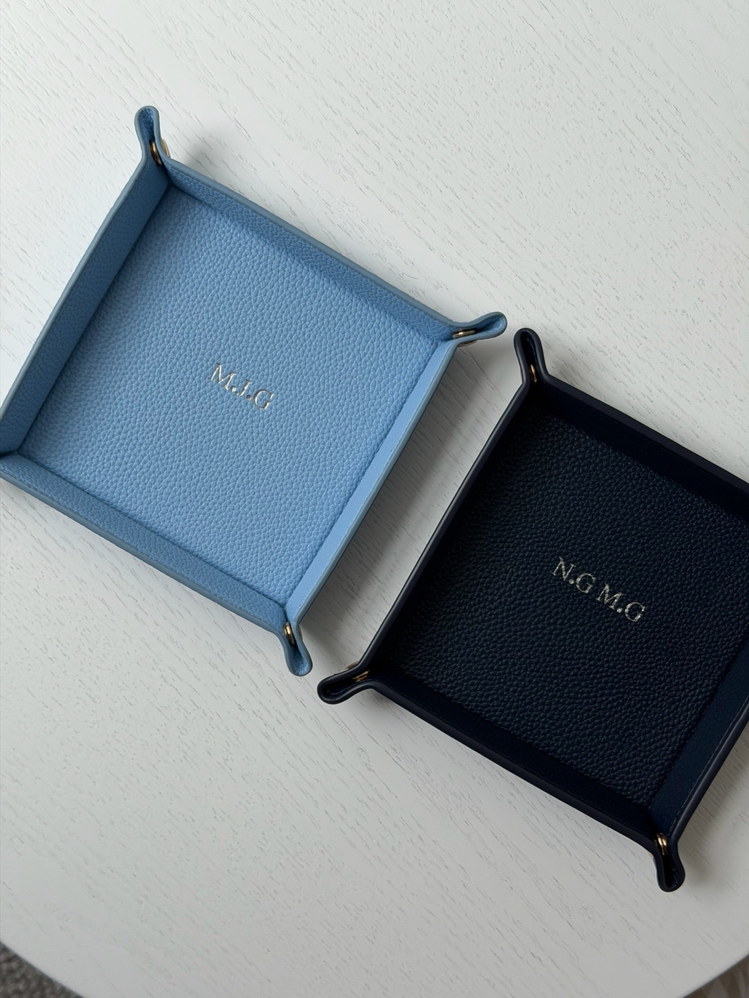 Treat yourself (and your trinkets) to our popular pebbled leather trays! Each tray features gold snap closure sides and gold or silver text in the centre.